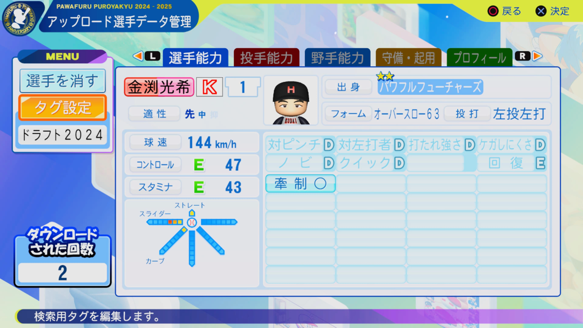 ・コントロールE47:青森県大会での公式戦での四球率は2点台前半。制球力は良い。